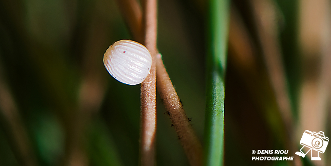 Cette petite boule ronde est un œuf du papillon l’Agreste – Hipparchia semele. Il doit mesurer environ 1 à 2 millimètres de diamètre.