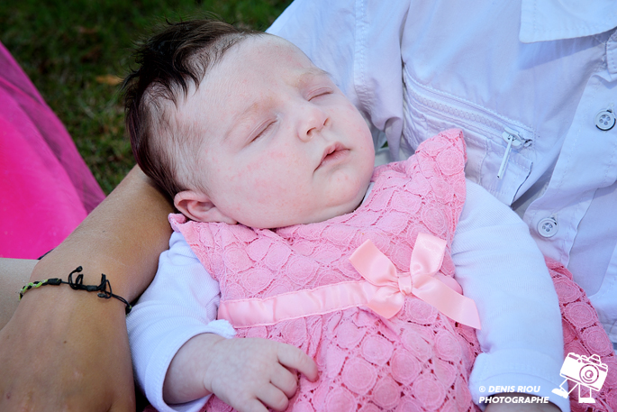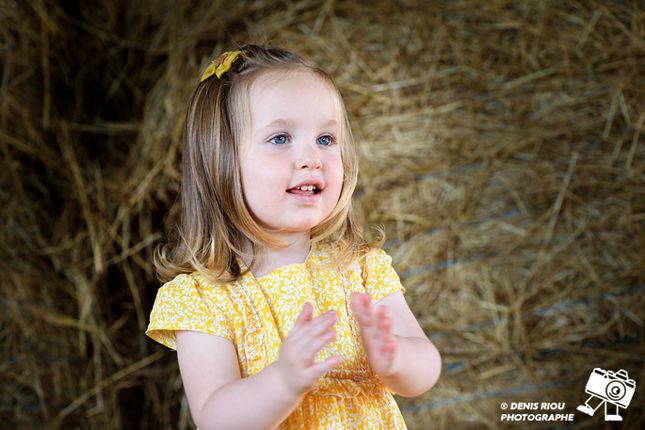 Charmante petite demoiselle toute de rose vêtue, cela contraste bien avec le jaune de la paille et du foin